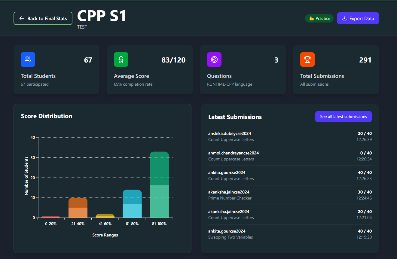 The online coding evaluation system provided instant feedback and real-time results, allowing students to immediately understand their mistakes. Faculty members could access assessment outcomes instantly, ensuring transparency and efficiency throughout the evaluation process.